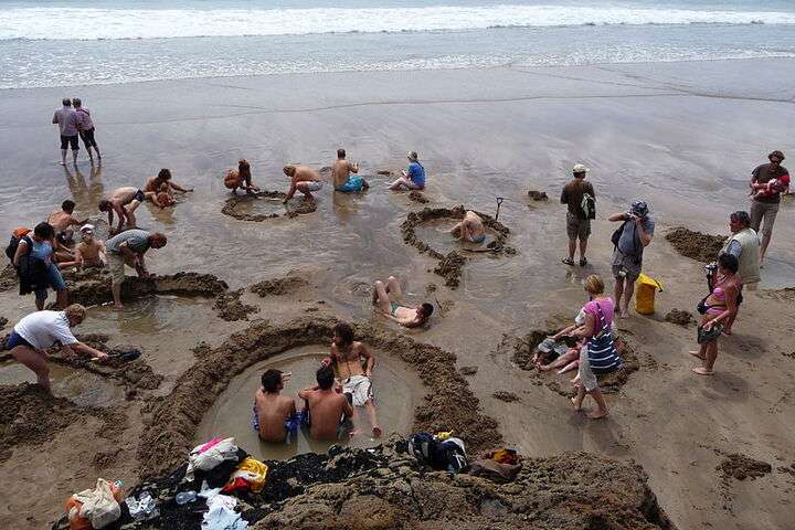 In Nieuw-Zeeland is Hot Water Beach een populaire bestemming voor toeristen. Als je een gat graaft en in het water gaat zitten, kun je genieten van het warme water dat een temperatuur van 64 graden kan bereiken. Dit komt doordat vulkanen de ondergrondse waterreservoirs opwarmen.