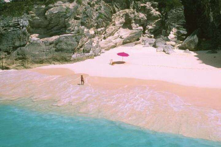 Ook op de Bahamas heeft het strand een aparte kleur. De rode schelpen van het ééncellige waterdier foraminifera mengen zich met het witte zand, waardoor het strand een mooie roze kleur krijgt.