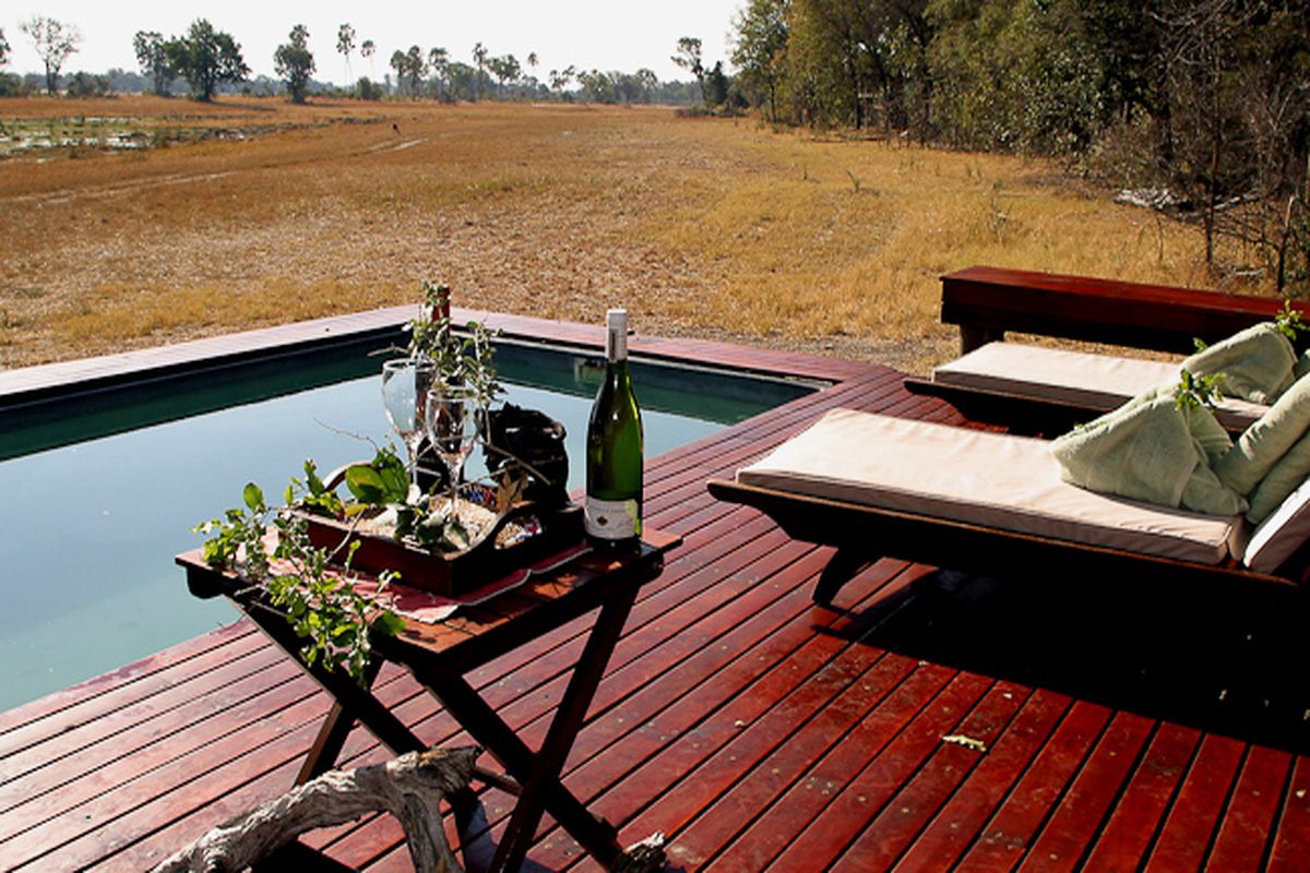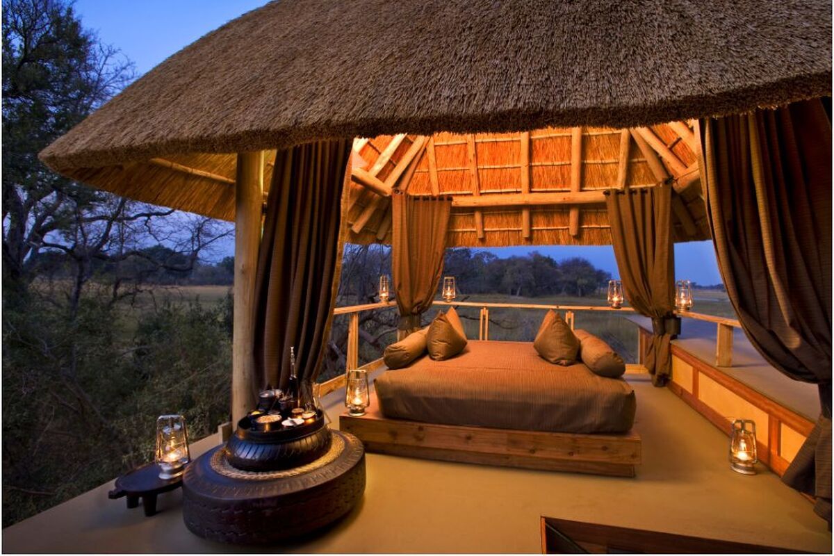 Xudum Okavango Delta Lodge ligt midden in de delta van een privé-concessie van 25.000 ha. De luxe accommodatie bestaat uit slechts 9 tenten waarvan de suites een eigen zwembad hebben. In deze lodge word je koninklijk behandeld en heb je de kans om neushoorns te spotten. Prijs is gemiddeld 350,- euro per nacht.