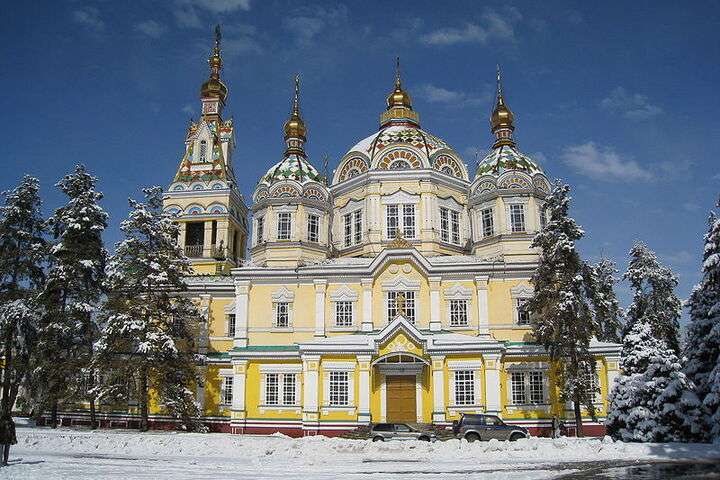 Midden in het Paniflov Park vind je de Zenkov-kathedraal, die vernoemd is naar zijn ontwerper architect A.P. Zenkov. Met zijn 56 meter hoog is het een van de grootste houten bouwwerken ter wereld. De kathedraal werd na vier bouwjaren in 1907 voltooid. Opmerkelijk is dat de kathedraal een aardbeving in 1911, die bijna de hele stad verwoestte, overleefde. Na de Russische Revolutie in 1917 werd het gebouw gebruikt als staatsmuseum voor de Kazachse Socialistische Sovjetrepubliek. In de loop der jaren heeft de kathedraal diverse seculiere doeleinden gediend. Zo is in de kerktoren bijvoorbeeld de eerste radiozender van de stad geïnstalleerd. Tussen 1973 en 1976 werd de kathedraal volledig gerestaureerd. In 1995 werd hij teruggegeven aan de Russisch-orthodoxe kerk.