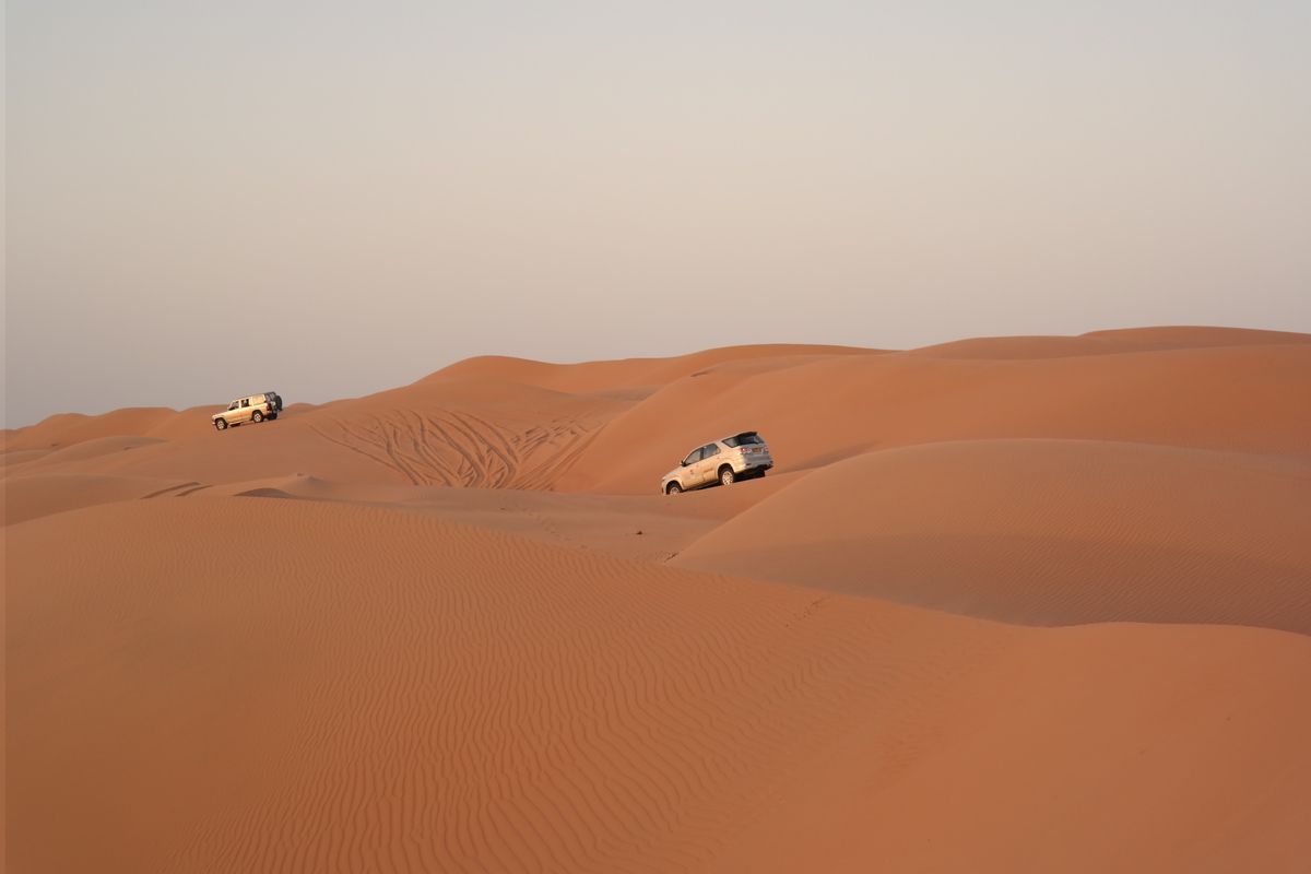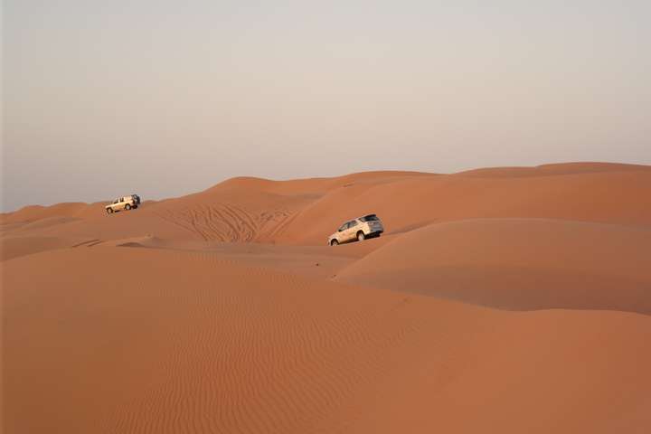 Een populaire manier om de woestijn te ontdekken is via dune bashing, wat 'duin stuiteren' betekent. Je rijdt met een 4WD-jeep zo snel mogelijk de duinen op en af. Omdat je behoorlijk door de auto wordt geslingerd heeft het de naam dune bashing.