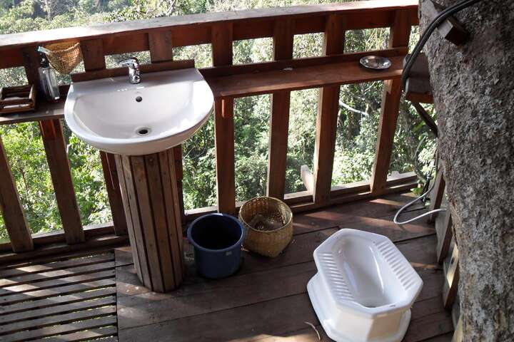 Onze boomhut? Een plaatje. Het platform waar je aankomt, is de hal met een trap naar boven, uitkomend op een groter platform rondom: de 'living' inclusief een klein keukentje. Hier lagen matrassen voor ongeveer vier tot zes man. Van daaruit was er nog een trap naar boven tot een klein platformpje met nog twee slaapplaatsen. Achter de hal het toilet, met een pijp naar een septic tank beneden - dit in tegenstelling tot de wc's bij de andere boomhutten, waar bij gebrek aan zo’n pijp je prestatie met een verkeerde wind weleens net verkeerd terecht zou kunnen komen. En de douche! Een heerlijke ervaring voor iedereen. Stel je eens voor, je staat hoog boven het woud, in je nakie en wordt hooguit bekeken door vogels en ander voorkomend wild. Je hebt een prachtig wijds uitzicht en het water uit de rainshower douchekop stroomt over je heen en zorgt voor een fantastisch mooi regeneffect wanneer je tussen de spijlen vloer onder je kijkt en het water in het woud terecht ziet komen. Ultiem, werkelijk waar!