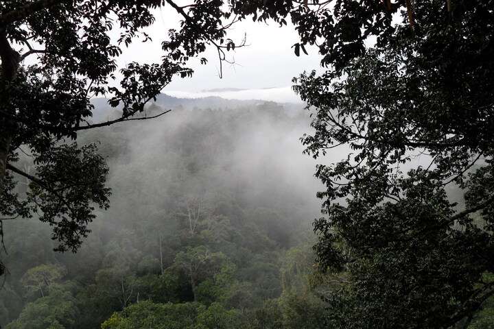 De 2e dag regende het toen ik om 06h15 wakker werd dus ik dacht 'we gaan nu vast niet het woud in'. Maar zoals de vorige dag afgesproken zoefde onze gids vrolijk om 06h30 onze boomhut binnen om ons op te halen. Kennelijk geen tijd te verliezen, want tijd om te plassen of water over mijn gezicht te splashen was er niet. Een zware tocht volgde, want voor mijn gevoel leken we maar te lopen en te lopen zonder ergens te komen. Net toen ik het beu werd, stak de gids een vinger op en werden we muisstil. In de verte hoorden we een langzame omhooggaande fluittoon: de Gibbon! Natuurlijk was het toen rennen geblazen om er nog dichter bij in de buurt te komen! Opzij opzij opzij, maak plaats, maak plaats, maak plaats! Jee, wat hadden we opeens een ongelofelijke haast! Mijn knieën gaven me signalen dat ik rustiger aan moest doen, mijn linkerenkel evenzo, maar nee, ik zou toch niet alleen voor een fluittoon zo vroeg in beweging zijn gekomen? Ik negeerde dus alle signalen...totdat het gefluit ophield, verstoord door het geluid van iemand die dichtbij op een zipline voorbij zoefde. Weg gibbon... 3 uur gewandeld, gerend en een beetje gezipt, maar beste mensen, IK weet hoe een Gibbon klinkt!